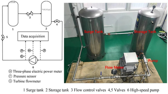 Based on the schematic diagram and the picture of the high-speed pump test rig displayed in Figure 5, the experimental test was performed on the prototype pump with six blades in the impeller and seven blades in the stay vane to verify the numerical results. The experimental system was a close cycle, in which water was driven by the pump and flows circularly between the surge tank and the storage tank.