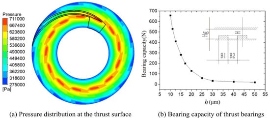 (a) Pressure distribution at the thrust surface and (b) bearing capacity of thrust hydrodynamic bearings under different film thickness at 7200 rpm.