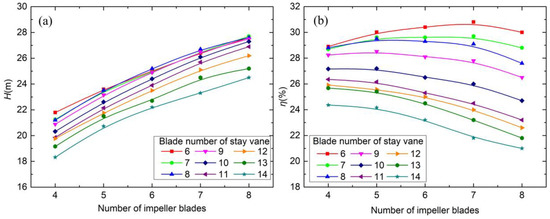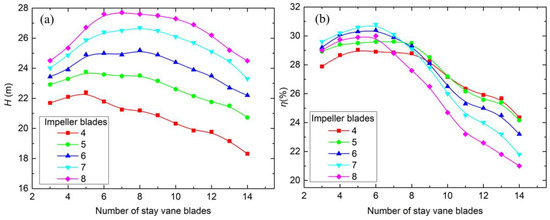 (a) Head and (b) efficiency under a different number of stay vane blades.