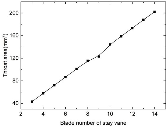 The throat area is the inlet of the diffuser section, which has the smallest flow area. The size of the throat area greatly affects the pump performance. The increasing trend of the throat area with the blade number is shown in Figure 10, which results in a smaller area ratio, the reduced flow velocity through the throat, and ultimately the decreased head. Oppositely, when the blade number of the stay vane is very small, there is a mismatching between the impeller and the stay vane. The backflow and secondary flow generated in the circular flow path at the rear of the stay vane reduce the head and efficiency of the whole pump.