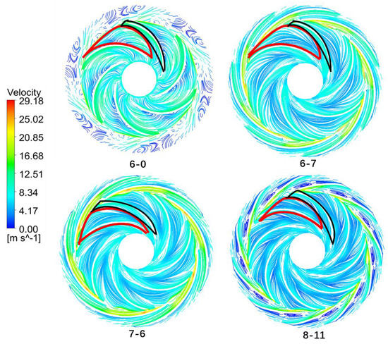 The internal flow fields were studied under four representative cases listed in Table 4. The computational cases are the combinations of different blade number in the impeller and the stay vane. The case with the seven-blade impeller and the six-blade stay vane had the highest efficiency. Case 6-7 was the prototype in the experiment. Case 6-0 with no blades in the stay vane was an extreme case. Case 8-11 was another extreme case with more blades in the impeller and the stay vane.
