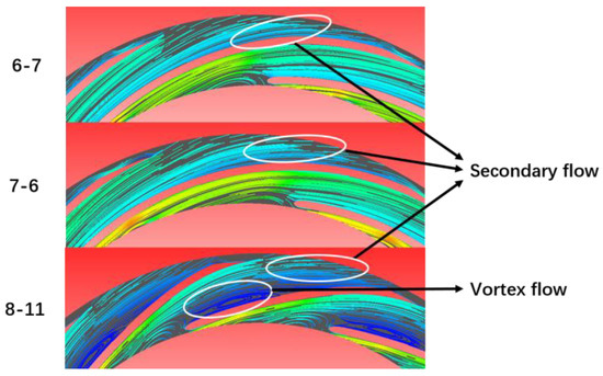 Figure 12 shows the enlarged velocity streamlines on the stay vane. Different degrees of the secondary flow exist at the diffuser of the stay vane under different computational cases. The regions of the secondary flow and vortex flow were larger under Case 8-11. This phenomenon reduced the efficiency to 23.3%.