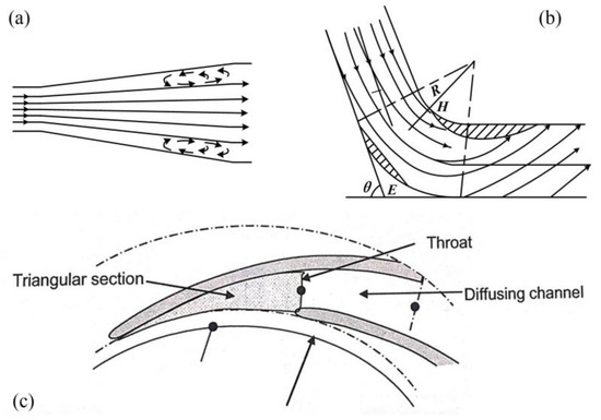 (a) Diffusion flow, (b) curved duct flow, and (c) diffusing channel of stay vane [26].