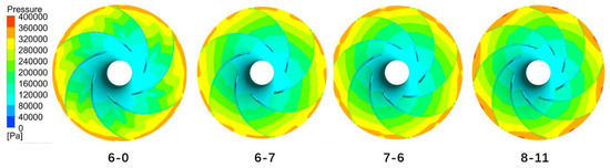 The static pressure distributions of high-speed pumps under four computational cases are presented in Figure 14. There was a clear gradient of pressure distributions in the flow path of the impeller. The low-pressure area focused on the leading edge of the blades. The flow area decreased when the number of impeller blades increased. Because of the enhanced restriction on the flow, it was harder to form the backflow in the flow path. The pressure at the outlet grew higher and higher. It was clearly visible that the pressure gradient distributed nonuniformly under Case 6-0 with no stay vane, especially when comparing with Case 6-7. Further, a lower pressure area was found in the middle of the flow path, given the pressure in the two sides. The comparison of Figure 11 and Figure 14 indicates that the appeared vortex significantly decreased the head and efficiency of the high-speed centrifugal pump.