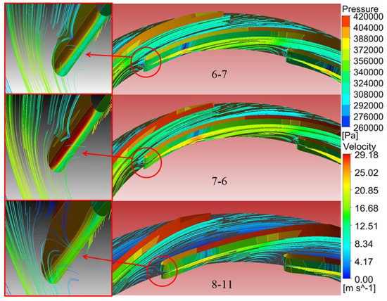 The static pressure distributions and velocity streamlines on the stay vane under different computational cases are shown in Figure 15. The fluid pressure decreased first and then increased when flowing on the suction surface of the stay vane. Accordingly, the velocity followed the trend of pressure. It led to the appearance of low-pressure near the midpoint of the stay vane inlet. The flow was squeezed by the blades and the vortex was inevitably generated on the pressure surface of the stay vane inlet. There was a high-pressure area at the blade when the vortex appeared. The pressure on the leading edge of the blade increased rapidly to the high-pressure area and then decreased. It gradually increased when the fluid flowed into the diffusion section. Comparing the numerical results under the three cases, the vortex area, being proportional to the blade number of the stay vane, was the largest for Case 8-11. The structure of Case 7-6 had a smaller vortex area and then a higher efficiency than Case 6-7.