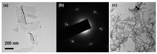 (a) TEM images and (b) selected area electron diffraction (SAED) patterns corresponded to graphene oxide (GO) nanosheets; (c) TEM image of a cellulose nanocrystalline (CNC).