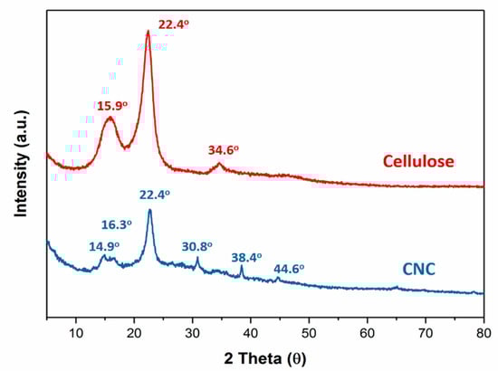 The colloidal suspensions of the CNC exhibited a nematic liquid crystalline alignment after the acid hydrolysis conditions were optimized []. The XRD spectra (Figure 4) showed that the crystallization of the pristine cellulose at 2θ = 15.9°, 22.4° and 34.6°. However, the half-height width at 2θ = 22.4° in the pristine cellulose decreased from 1.97° to 1.37° after the cellulose was hydrolyzed by sulfuric acid (CNC). This indicated that the pristine cellulose fibers were decomposed to nanoscale fibers, but still retained the crystallization. The CNC displayed six crystalline peaks at 2θ = 14.9°, 16.3°, 22.4°, 30.8°, 38.4°, and 44.6°, showing that it had a higher crystallization than in pristine cellulose.