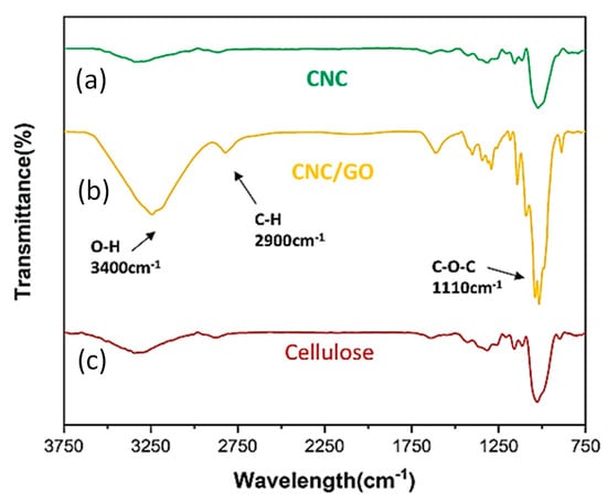 Furthermore, from FTIR spectra (Figure 5), the splitting peak at 1110 cm−1 was found in the CNC/GO nanocomposites, showing the interaction between CNC (–OH) and GO (–COOH). Further, the characteristic functional groups of O–H and C–O–C still existed after the cellulose was hydrolyzed by sulfuric acid (CNC).