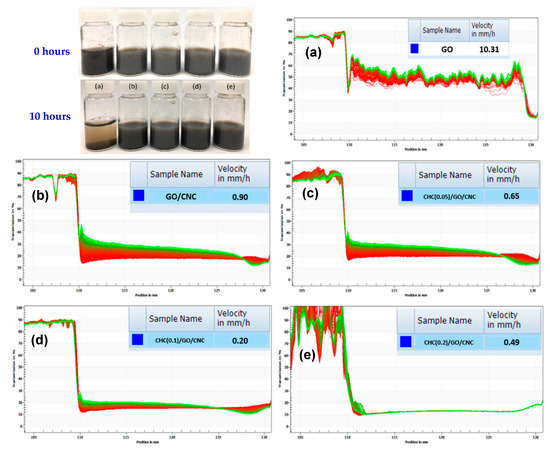 The sedimentation test at the initial state and after 10 h incubation in the water solution; and the Lumisizer® test (the sedimentation rate) of (a) GO; (b) GO/CNC, and the CHC/GO/CNC nanocomposite suspension with the different CHC concentrations of (c) 0.05 wt%; (d) 0.1 wt%; and (e) 0.2 wt%.