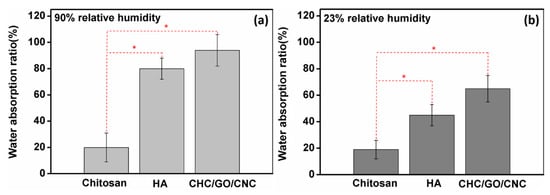 Water absorption ability of pristine chitosan (CS), hyaluronic acid (HA), and the nanocomposite hydrogel (CHC/GO/CNC) at the relative humidity of (a) 90% and (b) 23%. * The statistical analysis (Student’s t-test) showed a significant difference (p < 0.05) between the two observed groups (chitosan with HA and CHC/GO/CNC, respectively) at the relative humidity of (a) 90% and (b) 23%.