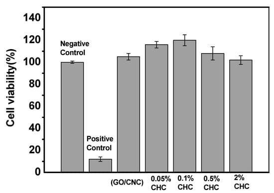 From the results of the 3T3 fibroblast survival assay (Figure 8), it was found that 5% DMSO addition (positive control) showed high cytotoxicity against 3T3 fibroblasts. However, it showed great biocompatibility in the sample of GO/CNC (without CHC). When the CHC addition was 0.05–0.1 wt%, the cell viability (%) was higher than the negative control (100%), which can increase the growth of 3T3 fibroblasts up to 10–20%. When the concentration was higher than 0.5–2 wt%, the cell viability dropped slightly to 98–100%, but it still showed no cytotoxicity to 3T3 fibroblasts.