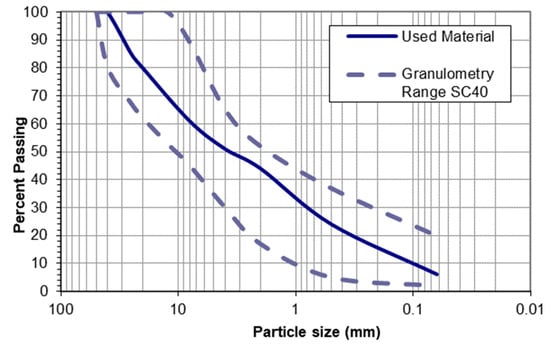 The granular material used in the laboratory trials was recycled pavement taken from road SA-801 (Peñaranda de Bracamonte to Campo de Peñaranda) from the west of Spain, with a maximum aggregate size of 40 mm. Figure 2 shows the granulometry of the material, which is inside the range of the SC40 (soil–cement with a maximum aggregate size of 40 mm) according to the Spanish standards []. It not was necessary to add any aggregate to improve the grading. The recycled material exhibited no plasticity and was free of organic matter and other substances that might prevent the cement setting.