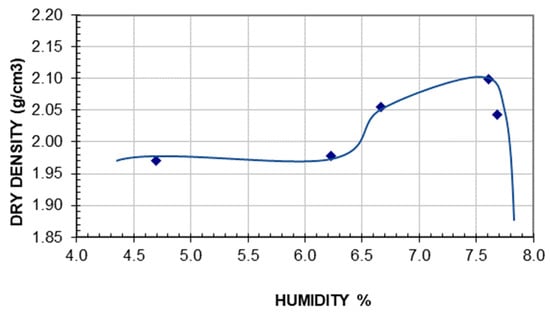 The determination of maximum dry density and optimum moisture content was conducted following the UNE 103-501-94 [] for cylindrical samples, whose prescriptions are analogous to the ASTM D1557-12 []. The density to be achieved in the test specimens was 2.10 g/cm3 with an optimum modified Proctor moisture content of 7.61% [] (Figure 3).