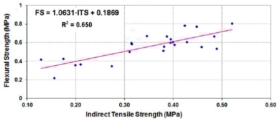 An additional equation for estimating the flexural strength at long-term of the FDR with cement was developed as a function of the unconfined compressive strength and the indirect tensile strength by means of a multiple linear regression, as shown in Equation (4).