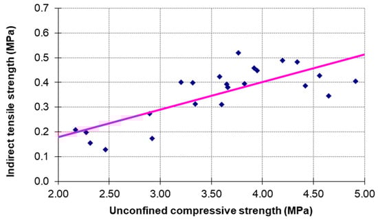 Equation (4) has a coefficient of determination (R2) of 0.684. Including an intercept in Equation (4) made the coefficients of the intercept and UCS not significant. Without the intercept, both coefficients are different from 0, with a significance level over 99% (p-value of the Student’s t-test >0.99).