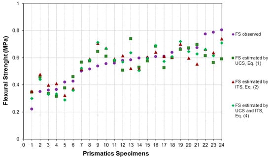 This FS test is carried out using prismatic specimens and manufacturing them requires a high level of qualification and experience within the testing team [,]. This is the main reason for usually estimating their behavior from standardized tests, such as the unconfined compressive strength and the indirect tensile strength (ITS) tests [,,,]. For this reason, the method used in this research is the one proposed by the University of Burgos [].