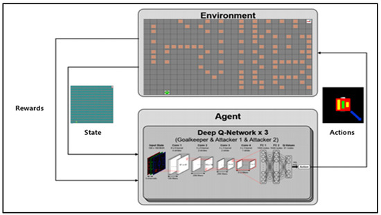 In the preprocessing part, the features of the image are searched using input images, and these features are collected and learned. In this case, the Q value is learned for each robot assigned to each role, but the CNN value has the same input with a different expected value. Therefore, the Q value is shared when learning, and used for the learning machine. In order to optimize the updating of Q value, it is necessary to define an objective function as defined as error of target value and prediction value of Q value. Equation (5) describes an objective function.