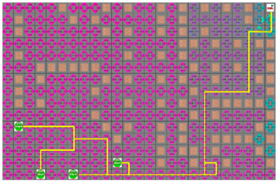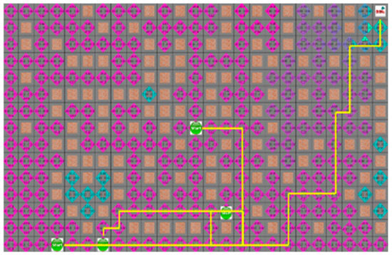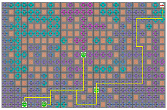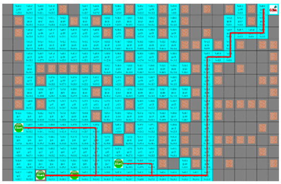 In the proposed algorithm under a dynamic environment where moving obstacles are located on the traveling path of the robot, they do not block the robot, as shown in Figure 18. It guarantees a short traveling distance of each robot.
