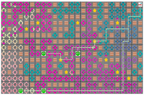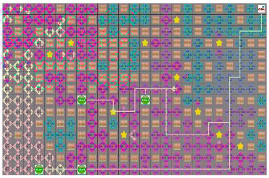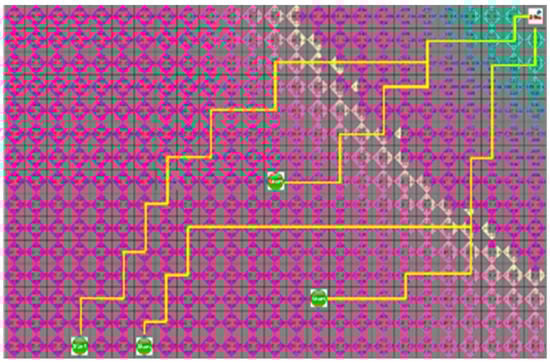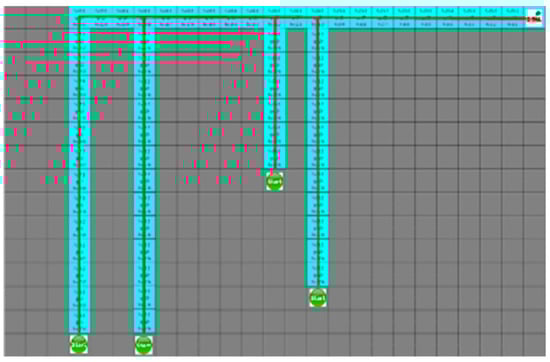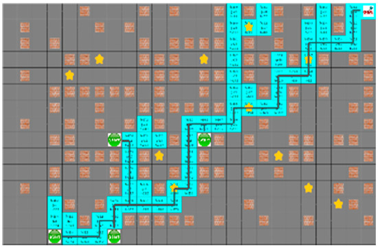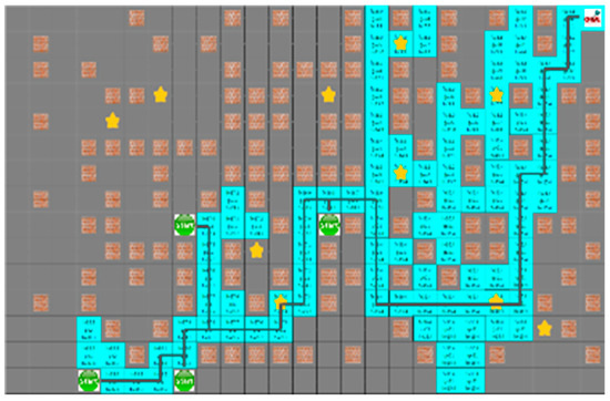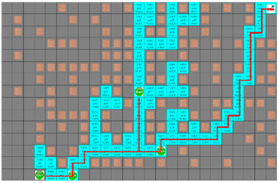 As shown in Figure 10 and Figure 11, which are the result of the A* algorithm and the proposed algorithm, respectively for the second case, the search range of the proposed algorithm is similar to that of the A* algorithm. The average search range of A* algorithm is 80 node visitation. The shortest paths of robots 1 to 4 were 33, 29, 28, and 21 steps, and the proposed algorithm had 65 visited nodes, where each robot pathare 34, 36, 32, and 25 steps, respectively.