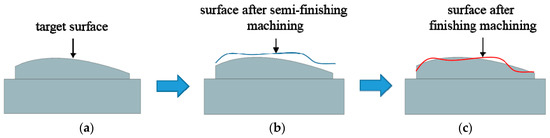 Illustration of the surface after semi-finishing machining and after finishing machining; (a) target surface of machining; (b) the profile after semi-finishing compared to the target surface; (c) the profile after finishing compared to the target surface.