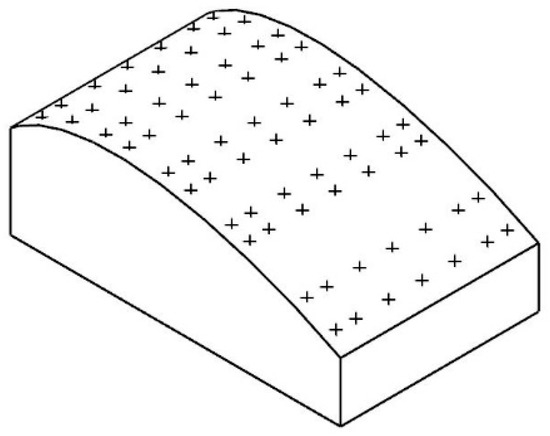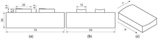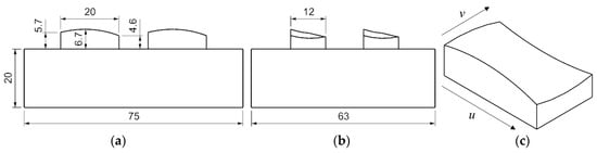 The workpiece material for the experiment was A6061-T6 aluminum alloy, and the size was 75 × 63 × 30 mm. In this study, three different surfaces were adopted for the experiment. For each surface, we machined four replicas so that we could obtain more measurement data. There are three profiles mainly used in the free-form surface design, as shown in Figure 2, Figure 3 and Figure 4, all of which are quadratic curved surfaces. The first surface, Surface one, is shown in Figure 2. The curves in the u-direction on the curved surface are identical quadratic curves, and those in the v-direction are horizontal straight lines.