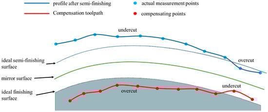 In this study, the mirror compensation method was used to compensate for the errors of free-form surface machining. The compensation method was used after the semi-finishing machining was completed. The on-machine measurement was made on the semi-finishing surfaces to obtain the actual semi-finishing surface. Then, a mirror surface was introduced to mirror the actual semi-finishing surface to obtain the finishing surface for error compensation. The mirror surface is the mid-surface between the ideal semi-finishing surface and the ideal finishing surface, as indicated in Figure 6. This method finds where there is an undercut and where there is an overcut after semi-finishing machining. As illustrated in Figure 6, an undercut indicates that the remaining amount of material has exceeded the expected amount of material; an overcut indicates that the remaining amount of material has fallen short of the expected amount of material. Afterward, the semi-finishing surface is mirrored. The undercut locations on the semi-finishing surface will receive overcut during the finishing machining; the overcut locations will receive undercut during the finishing machining. As a result, after finishing machining, the machined surface is expected to approach the expected ideal surface or the target surface.