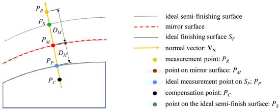How to use the mirror compensation method to find the compensation points is illustrated in Figure 7. First, we defined our ideal point PP on the ideal finishing surface SF. Then, we could obtain the normal vector VN at PP on the ideal finishing surface SF. As explained previously, the mirror surface is the mid-surface between the ideal semi-finishing surface and the ideal finishing surface. Therefore, the distance DH, which is half of the stock for the semi-machining, from PP to the mirror surface is known. Then Equation (1) can be used to find PM on the mirror surface. As long as PM is known, the distance DM from PM to PR can be readily obtained, as can the compensation point PC by using Equation (2).