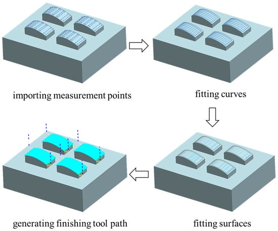 The complete compensation process is shown in Figure 8. We used the C# program we developed to import the on-machine measurement results. Because we used the same work coordinate system created by G54 command for cutting tool path and the on-machine measurement, the on-machine measurement data can be registered with the CAD model used for generating the G code for machining. Then, the mirror compensation method can be applied to find the locations of the compensation points. It follows that the curve fitting is performed on the compensation points, and the free-form surface can then be constructed by using the Through Curve Mesh fitting function in NX. Finally, the fitted surfaces will replace the original surfaces in the CAD model so that the model is reconstructed for generating the finishing tool path. The program we developed can automatically execute the entire process. For a model like the one shown in Figure 8, it took only about 30 s to complete the processes on a regular PC. It may take a much longer time to complete the same task by manual operation.