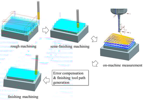 The complete machining process, including error compensation, is shown in Figure 9. First, the roughing machining and semi-finishing machining are performed. Then the on-machine measurement is performed, and the measurement data are recorded inside the CNC controller. Next, the automatic compensation program is used to perform the procedure, as illustrated in Figure 8. After obtaining the finishing tool path, we can perform the finishing machining to complete the machining with error compensation.