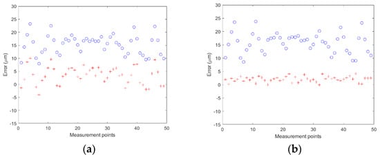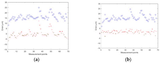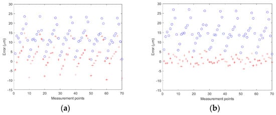 (a) The error distribution of replica one before (blue circles) and after (red plus signs) tool radius compensation for Surface two; (b) the error distribution of replica one before (blue circles) and after (red plus signs) mirror compensation for Surface two.
