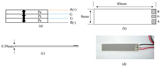Final design (a–c) of a three-layer piezoelectric actuator based on the results of simulations and (d) is a manufactured actuator. Pe and Pi are 0.1 mm and 0.14 mm, respectively. A and B are positive and negative electrodes, and G is the ground, respectively. The final thickness (0.39 mm) was estimated including bonding.