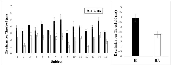 Discrimination thresholds (temporal sensitivity) estimated on tactile key click effects on tablet touchscreens: thresholds estimated per participant (left) and the average thresholds (right) for the haptics alone (H) and haptics with audible sound (HA) conditions.