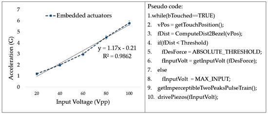 where G is a desired acceleration value, and Vi denotes an input voltage value to piezoelectric actuators to be controlled. In this study, G was set to 1.5 G, which was above the detection threshold (1.17 G) found by Kim [5]. The overall algorithm can be summarized as follows: