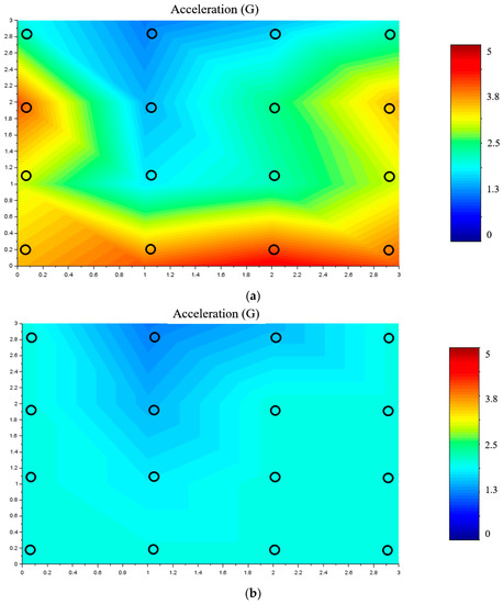 The implemented algorithm equalizing the strength of tactile feedback on the touchscreen was tested and compared with the measured force distributions generated from four actuators. Two actuators were attached next to the home button, and the other two actuators were located at the middle of two vertical sides, respectively. The same accelerometer was used for measuring tactile force feedback on the touchscreen. Accelerations at sixteen points equally spaced on the touchscreen were measured when all of the piezoelectric actuators were bent at the same time. Then, the measured values were graphically visualized in Figure 7. In the plots, the redder is the stronger tactile feedback. It was obvious from the results that the force distribution was greatly improved after applying our proposed global equalization method.