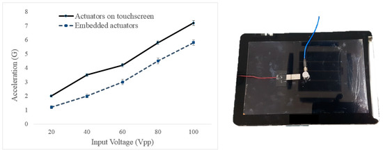 Acceleration values (left) measured on a 10.1 inch touchscreen with a three-layer piezoelectric actuator as a function of input voltage (Vpp) for two conditions, free stroke on a detached touchscreen (right) and after embedding the actuators in a tablet.