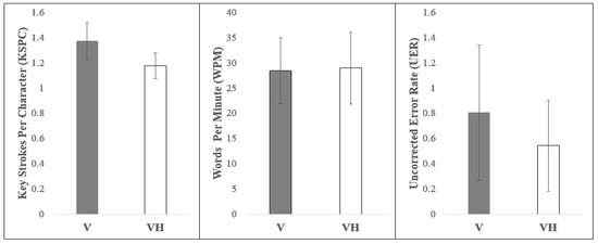 Figure 10 shows the results of typing performance (KSPC, WPM, UER) tested with the haptic soft keyboard. The bars represent the average values of each metric obtained from the experiment, and the error bars show the standard deviations. Note that a lower value meant better performance, except with WPM, which was interpreted as typing speed. As an efficiency index, KSPC ranged from 1.17 to 1.38, with VH appearing to be more efficient, which showed better productivity when tactile feedback was added. The average UERs, typing errors, were 0.54 and 0.8 for VH and V, respectively, which demonstrated improved accuracy with tactile feedback. In contrast, there was no difference in typing speed observed from the average WPM values from 28.4 and 28.9 for V and VH, respectively. A one-way ANOVA showed that there was no significant difference (p >> 0.05) across conditions for the three metrics.