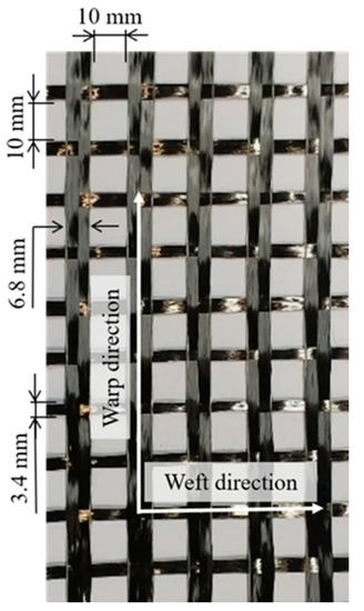 In this study, the textile-reinforced mortar (TRM) composite materials were composed of alumina cement-based mortar reinforced with carbon fiber textile. Figure 1 shows the geometrical characteristics of the carbon fiber textile utilized in this experiment as a textile reinforcement. According to the manufacturer, each warp yarn of the carbon fiber textile had an approximate width of 6.8 mm and an approximate thickness of 0.35 mm and was composed of 12,000 carbon filaments with filament diameters of 7 μm (Toray T700-12k). In addition, the carbon fiber textile had an average tensile strength and elastic modulus of 4300 MPa and 240 GPa, respectively.