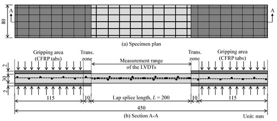For the first surface treatment method (Figure 3b and Figure 4b), approximately 60 g of epoxy resin was used to fully impregnate the carbon fiber filaments within the lap-spliced region of the textile reinforcement. For the second surface treatment method (Figure 3c and Figure 4b), at the lap-spliced region of the textile reinforcement, the carbon fiber filaments were also completely impregnated with epoxy resin (60 g). Then, the carbon fiber textile was covered with aluminum oxide (Al2O3) powder with a diameter of 250 μm by using a high speed-spraying gun one day after epoxy impregnation [37,38]. The surface treatments were performed on both sides of the carbon fiber textile to ensure uniformity. The surface treatment methods were applied according to Truong et al. [39].