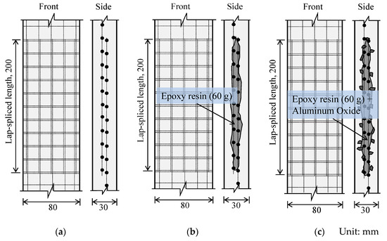 Illustrative details in the lap-spliced zone: (a) lap-spliced zone without surface treatment; (b) lap-spliced zone impregnated by epoxy; (c) lap-spliced zone coated with aluminum oxide after epoxy impregnation.