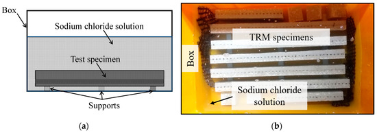 Test setup of TRM coupons subjected to the chloride environment: (a) scheme of the test setup of TRM coupons subjected to the chloride environment; (b) photo of test setup.