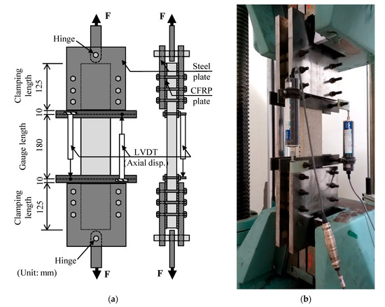 Figure 8 shows the experimental setup of the direct tensile test for the TRM coupons. The steel plates were utilized to clamp the gripping regions of the TRM coupons and fixed by steel bolts. The clamping force induced during fixing the steel plates may have caused a high compressive force to be acting on the gripping area of the TRM coupons. Therefore, to avoid any damage within the clamping areas, and to ensure an effective force transfer from the universal testing machine, carbon fiber reinforced polymer (CFRP) tabs with a thickness of 2 mm were utilized to strengthen the gripping regions of the TRM coupons (Figure 8a). The slippage phenomenon may have occurred at the interface between the CFRP tabs and the steel plates. Hence, the surface of the steel plates was roughened to increase the friction between them. Furthermore, the non-alignment of the TRM coupons and the steel plates may have triggered a bending moment during the tensile test. Thus, a steel bar which could rotate freely around a hinge (Figure 8a) was used to connect the TRM coupons with a testing machine. This clamping method was also used in the studies of Truong et al. [39] and Kim et al. [41]. To perform the tensile tests, a universal testing machine (UTM) with a loading capacity of 1000 kN was utilized. The tensile test was performed according to ASTM D3039, with the applied load under displacement control at 0.5 mm/min [42].