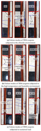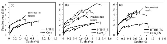 Figure 17 shows the tensile stress–strain relationship of TRM coupons subjected to the high temperature and humidity environment. Figure 17 shows that the HTHE coupons subjected to the high temperature and humidity environment revealed a significant reduction in stiffness, but a slight reduction in strength, and a slight increase in strain compared to that of the Com coupons. In addition, in the Com series, the positive effect of the surface treatment on the tensile behavior was significant, while that in the HTHE series was not significant.