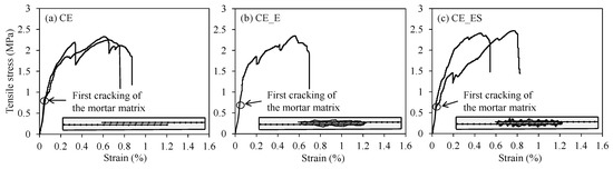 Figure 12 shows the stress–strain relationship of the first test series with different surface treatment methods in the chloride environment. In the uncracked stage, the stress–strain relationship of the TRM coupons showed a linear elastic curve with a high slope by the combined working of both the mortar matrix and carbon fiber textile. After that, at around 0.75 MPa of tensile stress, the first cracks appeared in the middle of the TRM coupons, then more cracks appeared near the transition zone, and these cracks continued to widen, until failure (Figure 9a). Figure 13 compares the average values of initial stiffness, ultimate strain, cracking tensile strength, and peak tensile strength between TRM coupons with different surface treatments. There was no significant difference in most of the tensile behavioral characteristics, regardless of the surface treatment (Figure 13a and Table 2). However, the ultimate strains of the surface-treated TRM coupons decreased, in particular, the CE_E coupons showed a decrease of 13.09% compared to that of the CE coupons. The chloride environment might negatively affect the interfacial bonding once the chloride solution penetrates the interface made of epoxy and coating with aluminum oxide powder. The CE_E coupons showed longitudinal cracks that appeared during the tensile test (Figure 9a), during which cracking is expected to be related to bond deterioration.