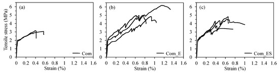 Additionally, the results of TRM coupons in this series were compared to the previous test results of TRM coupons [39], with slightly different amounts and details of carbon fiber without exposure to the chloride environment. The reference TRM coupons in the previous study were Com, Com_E, and Com_ES series; the coupons Com, Com_E, and Com_ES mean the comparative coupons without surface treatment, the comparative coupons with epoxy impregnation, and the comparative coupons with sand coating after epoxy impregnation, respectively. Figure 14 presents the previous test results of the TRM coupons under sound conditions. Figure 12a and Figure 14a show that the CE and Com coupons without surface treatment revealed a significant difference in stiffness. In addition, those TRM coupons showed approximately 20% strength and 30% deformability differences. The initial stiffness and ultimate tensile strength of the CE series under chloride environment were decreased by 25–50% and 50%, respectively, compared to those of the Com series under sound conditions. This is because the chloride ion could penetrate inside the mortar and weaken the properties of the textile and the interfaces between textile and epoxy. Donnini [44] also showed that the tensile strength of glass yarns immersed in saline solution could be decreased by 40%, compared to that of controlled glass yarns. Moreover, Donnini indicated that the surface treatment using the polyvinyl alcohol (PVA) seems to be unable to protect the fiber textile reinforcement from a chloride environment, based on Scanning Electron Microscope (SEM) analysis on the cross-section of treated fiber textiles.