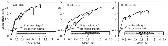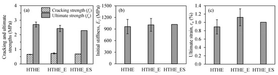 Figure 15 shows the stress–strain relationship of the TRM coupons with different surface treatment methods in the high temperature and humidity environment. In the uncracked stage, the TRM coupons in this series showed almost the same initial stiffness values (Figure 16a and Table 2). The crack pattern and failure mode in this series were the same as in the first series (Figure 9b). In addition, Figure 16 shows the average values of ultimate strain, cracking tensile strength, and ultimate tensile strength of TRM coupons. As presented in Figure 16a, the cracking tensile strengths were almost the same, but the ultimate tensile strengths of the HTHE_E and HTHE_ES coupons showed a slight decrease of 10.09% and 12.53% compared to that of coupons HTHE, respectively. In contrast, the ultimate strain of the HTHE_E and HTHE_ES coupons showed increases of 25.50% and 12.53%, respectively, compared to that of coupons HTHE. The results show that the high temperature and humidity environment affected the bond strength and deformability at the fabric–mortar interface. During the tensile test, longitudinal cracking at the side of the test coupons HTHE and HTHE_E was also observed (Figure 9b).