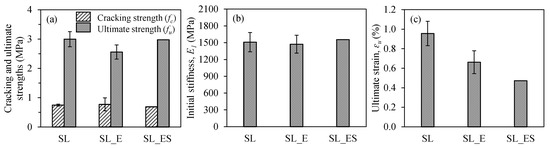 Figure 18 shows the stress–strain relationship of the TRM coupons with different surface treatment methods subjected to sustained load. Similar to the first two test series, the average cracking tensile strengths and the initial stiffness in this series were almost the same (Figure 19 and Table 2). Figure 19b clearly shows the effect of sustained load on the ultimate strain of TRM coupons with the different surface treatment methods. The ultimate strain of the SL_E and SL_ES coupons decreased by 30.78% and 50.59%, respectively, compared to that of the SL coupons. Meanwhile, the ultimate tensile strength in this series showed a fluctuation.