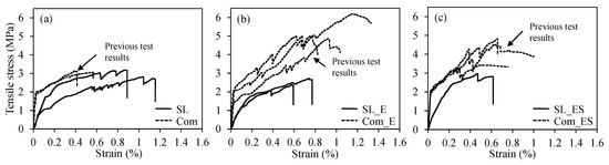 Figure 20 shows the comparison between TRM coupons with and without sustained load. The SL and Com coupons without surface treatment showed almost equal strength, but 95% deformability difference (Figure 20a). In the three previous test coupons of the Com series, the tensile strength showed a significant difference according to the surface treatment method. However, in the coupons of the SL series under sustained load, such a difference was not observed. This indicates that the improvement of tensile behavior due to surface treatment decreased because of the sustained load.