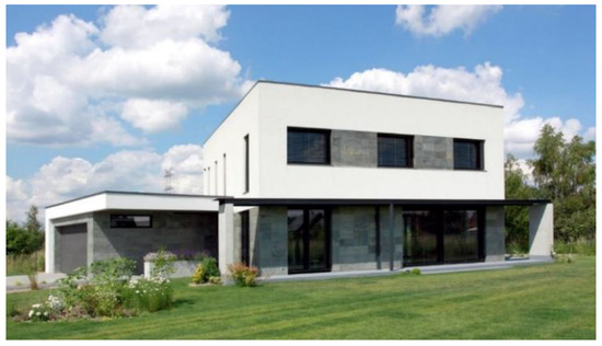 The case studied in this paper is a single-family residential building built in 2015. The building is located in the village of Zielonki Wies near Warsaw in Poland. The building consists of two main blocks. The shape of the garage section is parallel to the sides of the plot, while the residential part is rotated by 19.5° so that the wall with the largest amount of glazing is oriented south (Figure 1). During the winter only the residential part is air-conditioned by a continuous, heating system. The assumed indoor temperature as set on the thermostat, is 20 °C. The only available energy carrier at the site was electricity. For this reason, as well as for economic reasons, the designer used electric cables placed in a 5-cm thick concrete floor as surface heating.