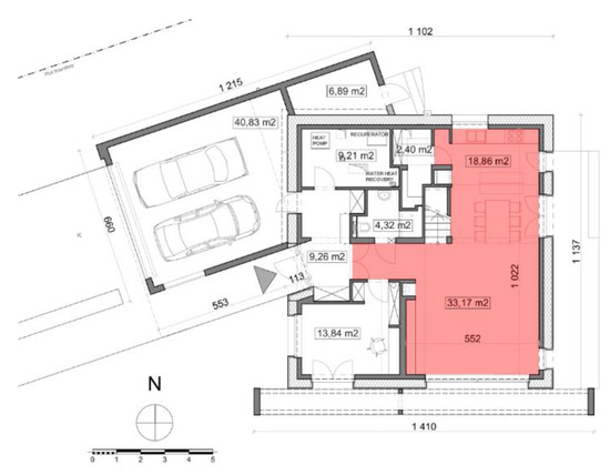 The usable area of the residential part of the building is 187 m2, the garage and the garden room are 47 m2. The study involved a thermal zone which consisted of the rooms located on the ground floor. These include the kitchen, the dining room and the living room, with large areas of glazing on the south side. The total area of the rooms analysed is 55 m2, with an internal (net) volume of 140 m3. The plan of the ground floor with the rooms considered in this study (marked in red) is shown in Figure 2.