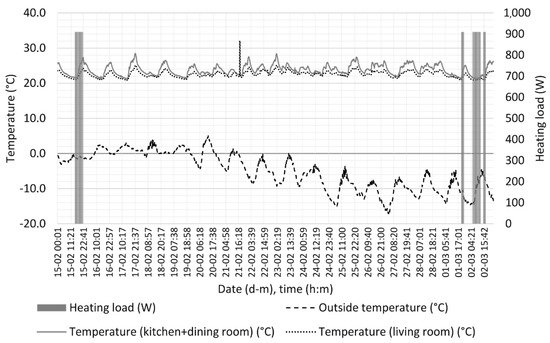 An exemplary series of data recorded from 15 February, 2018 to 2 March, 2018 is presented in Figure 3. Heating load (W) indicates that the actual temperature in the room was less than the temperature set on the thermostat (assumed indoor temperature) and thus the heating system was activated. Even during the period when the heating system was turned off, the indoor temperature exceeded 20 °C, and occasionally it even reached 28 °C. These temperature increases are the result of excess heat gains occurring in the zone. Periodic overheating can be limited by effective heat storage and the stored energy can be reused later to cover heating energy demand. The theoretical amount of energy stored during the heating season was calculated on the basis of the measurement data and it is presented in Section 5.
